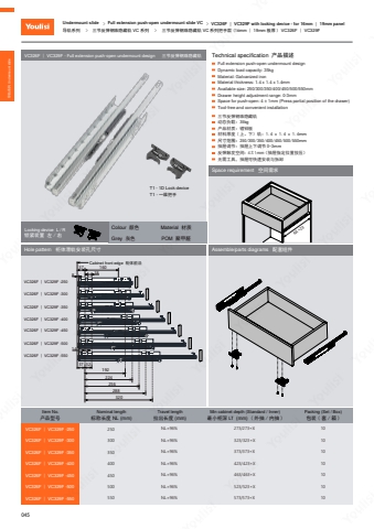 Undermount slide > Full extension push-open undermount slide VC %u5bfc%u8f68%u7cfb%u5217 > %u4e09%u8282%u53cd%u5f39%u94a2%u73e0%u9690%u85cf%u8f68 VC %u7cfb%u5217 > %u4e09%u8282%u53cd%u5f39%u94a2%u73e0%u9690%u85cf%u8f68 VC %u7cfb%u5217%u628a%u624b%u6b3e (16mm %uff5c 19mm %u677f%u539a ) VC326F %uff5c VC329F> VC326F %uff5c VC329F with locking device - for 16mm %uff5c 19mm panel045%u5bfc%u8f68%u7cfb%u5217 Undermount slideTechnical specification %u4ea7%u54c1%u63cf%u8ff0Assemble/parts diagrams %u914d%u5957%u7ec4%u4ef6 Item No.%u4ea7%u54c1%u578b%u53f7Full extension push-open undermount designDynamic load capacity: 35kgMaterial thickness: 1.4 x 1.4 x 1.4mmAvailable size: 250/300/350/400/450/500/550mmDrawer height adjustment range: 0-3mmTool-free and convenient installation%u4e09%u8282%u53cd%u5f39%u94a2%u73e0%u9690%u85cf%u8f68%u52a8%u6001%u8d1f%u8f7d%uff1a35kg%u4ea7%u54c1%u6750%u8d28%uff1a%u9540%u950c%u677f%u5c3a%u5bf8%u8303%u56f4%uff1a250/300/350/400/450/500/550mm%u62bd%u5c49%u8c03%u8282%uff1a%u62bd%u5c49%u4e0a%u4e0b%u8c03%u8282 0-3mm%u6750%u6599%u539a%u5ea6 ( %u4e0a%u3001%u4e0b%uff09%u8f68%uff1a1.4 x 1.4 x 1.4mm%u65e0%u9700%u5de5%u5177%uff0c%u62bd%u5c49%u53ef%u5feb%u901f%u5b89%u88c5%u4e0e%u62c6%u5378Nominal length%u6807%u79f0%u957f%u5ea6 NL (mm)Travel length%u62c9%u51fa%u957f%u5ea6 (mm)Min cabinet depth (Standard / Inner)%u6700%u5c0f%u67dc%u6df1 LT (mm) ( %u5916%u62bd / %u5185%u62bd )Packing (Set / Box)%u5305%u88c5 ( %u5957 / %u7bb1 )Space requirement %u7a7a%u95f4%u9700%u6c42NL+23250 NL%u00d796% 273/273+X 10300 NL%u00d796% 323/323+X 10350 NL%u00d796% 373/373+X 10400 NL%u00d796% 423/423+X 10450 NL%u00d796% 463/463+X 10500 NL%u00d796% 523/523+X 10550 NL%u00d796% 573/573+X 10Hole pattern %u67dc%u4f53%u6ed1%u8f68%u5b89%u88c5%u5b54%u5c3a%u5bf8 Material: Galvanized ironVC326F %uff5c VC329F - Full extension push-open undermount design %u4e09%u8282%u53cd%u5f39%u94a2%u73e0%u9690%u85cf%u8f68VC326F %uff5c VC329F -250VC326F %uff5c VC329F -300VC326F %uff5c VC329F -350VC326F %uff5c VC329F -450VC326F %uff5c VC329F -400VC326F %uff5c VC329F -500VC326F %uff5c VC329F -550VC326F %uff5c VC329F -250VC326F %uff5c VC329F -300VC326F %uff5c VC329F -350VC326F %uff5c VC329F -400VC326F %uff5c VC329F -450VC326F %uff5c VC329F -500VC326F %uff5c VC329F -550Colour %u989c%u8272 Material %u6750%u8d28Grey %u7070%u8272 POM %u805a%u7532%u919b %u9501%u7d27%u88c5%u7f6e %u5de6 / %u53f3Locking device L / RT1 - %u4e00%u7ef4%u628a%u624bT1 - 1D Lock deviceSpace for push-open: 4 %u00b1 1mm (Press partial position of the drawer)%u53cd%u5f39%u89e6%u53d1%u7a7a%u95f4%uff1a4%u00b11mm%uff08%u62bd%u5c49%u6307%u5b9a%u4f4d%u7f6e%u6309%u538b%uff0914250%ufffdL%ufffd@%ufffd=%ufffd=%ufffd$%ufffdY350%ufffdL400%ufffdL450%ufffdL550%ufffdL37 32224288192256320Cabinet front edge %u67dc%u4f53%u524d%u6cbf378 18160