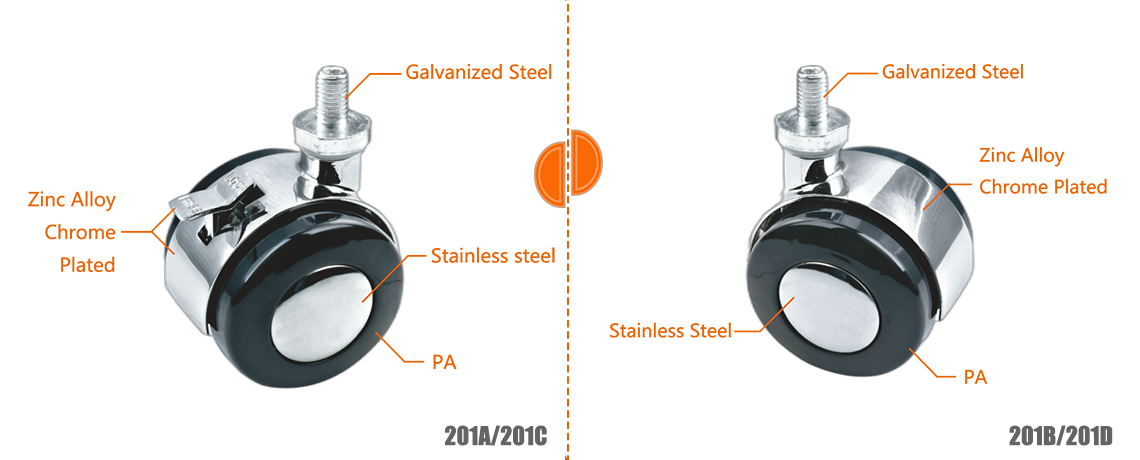 Brake function: turn up to LOCK, caster can stay in place; push down to UNLOCK, caster can be swivel and roll. (Available on 201A and 201C)