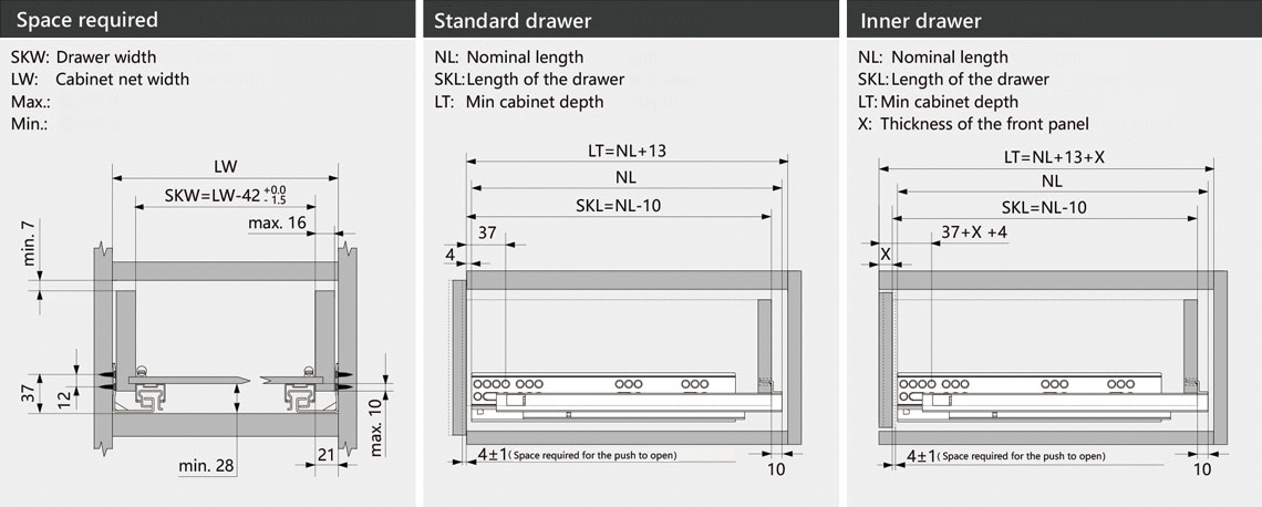| YL326F-450-S2 | 450mm(18"),Full Extension, Push and Open, Synchronized Undermount Slide With 2-dimentional Adjust Lock. | Pair | 398mm | 463/463+X | Full Extension |